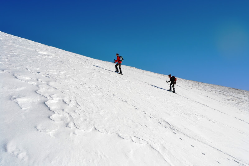 Agraïda pujada al Tuc de la Cigalera amb raquetes, amb bona neu, bon sol i bon temps que permet una immillorable panoràmica del conjunt de muntanyes de la Val d’Aran, del Pallars, del massís de la Maladeta, l’Aneto i un sens fi de muntanyes cobertes de la molsuda neu hivernal.