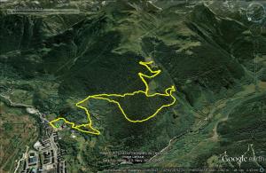 Seguim la pista forestal que puja serpentejant i suau fins a Era Tuca, ara si amb molta neu i sortejant algun arbre caigut travessat a la pista. La vista sobre la Vall de l’Arriu Nere és impressionant. Nevada i emboirada ofereix una vista imponent de la Forcanada. Tota la carena del Montpius, Letassi i Moncorbison amb respectables gruixos de neu.