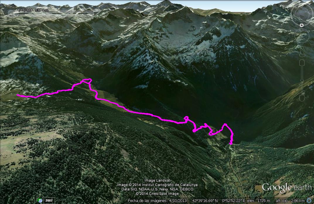 Seguint el curs de l’Arriu Rencules, que desaigua els estanys de Montacasau, arribem fins el punt de pista on es bifurca el GR-11 que porta fins als llacs. Nosaltres però seguim la pista, còmoda i sense complicacions, travessant sobre pegots de neu baixada sobre la pista per allaus caiguts i que ara no revesteixen problema.