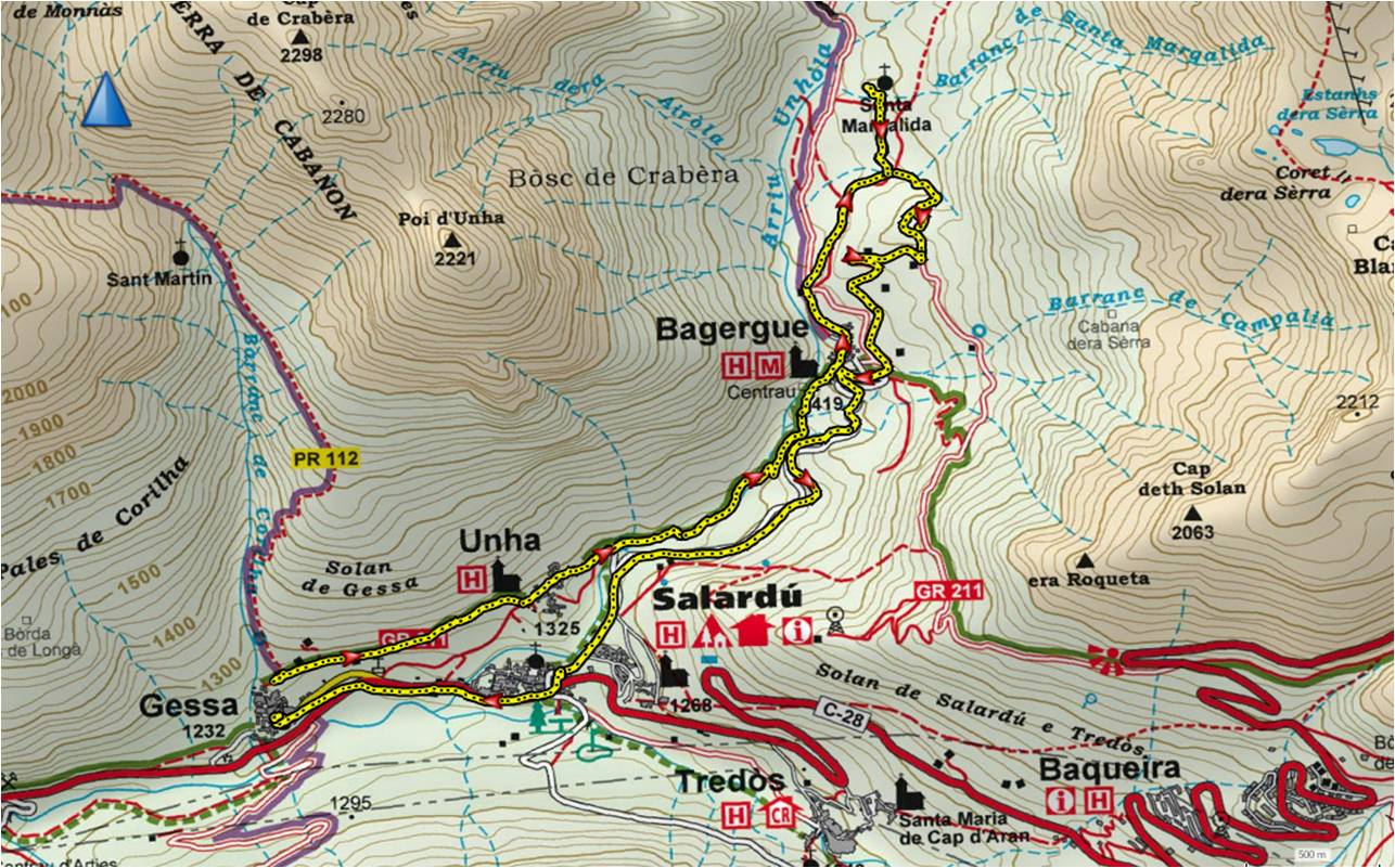 Arribem a Bagergue. Per pujar-hi amb raquetes has de ‘pedalar’ una mica més de quan fem aquest camí gairebé amb els ulls clucs quan decidim fer alguna cosa per entreteniment sense la neu. Travessem el poble i enfilem el sender en direcció cap a Santa Margalida. Una capella sobre un turonet que enfila la Vall de l’Unhola a 1.Km. de Bagergue.
