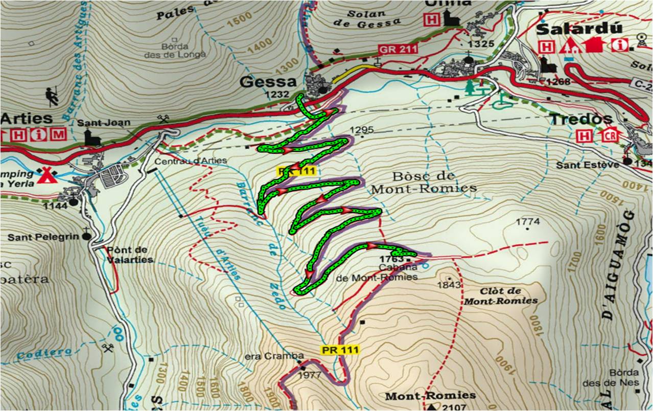 Sortim de Gessa, després d’una magnifica nevada de gairebé 48h nevant en un ambient gèlid però d’un dia a la Vall serè com un mirall. Amb les raquetes posades des del final del C/Major enfilem travessant la carretera sota el pont i travessant el riu en direcció al bosc de Montromies.