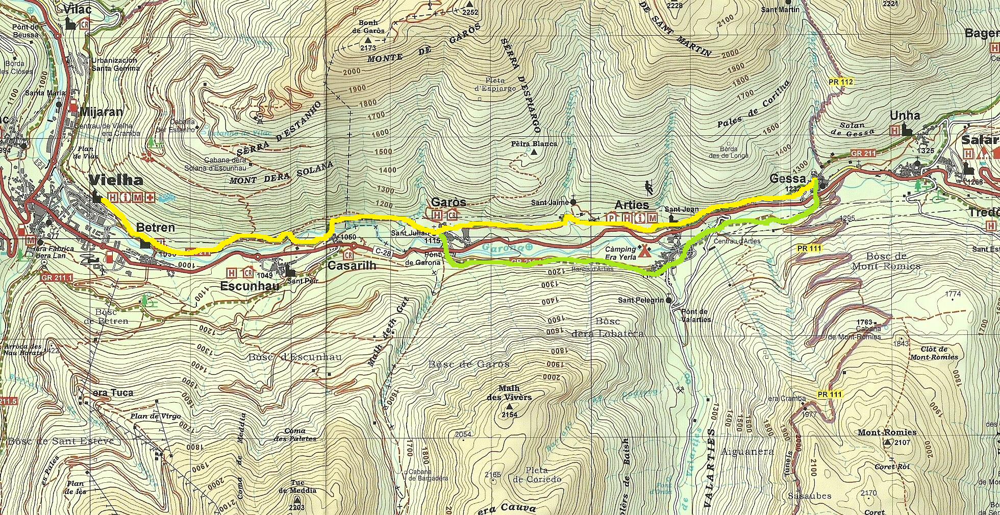 Continueu seguint les marques vermelles i blanques que us portaran fins a Betren. D’Escunhau a Betren el camí continua baixant, passant per bonics prats de flors, que mereixen una fotografia, fins arribar al riu just a sota del poble de Betren- Pugeu cap al poble i seguiu el carrer principal que és a tocar de Vielha. Passegeu pels carrers de Vielha i descanseu a la plaça de l’església veient passar la gent.