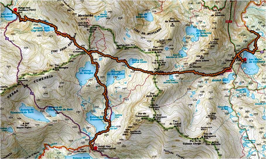 Comencem la veritable travessa embocant el GR-11.18 en direcció al Port de Caldes (2.568 m.), que assolim sense complicacions. A l’esquerre el Tuc deth Pòrt, enrera la brillantor a contrallum del Lac Major de Colomers, punt de partida, i al davant el massís del Montardo i als peus l’Estany del Port de Caldes i el de Mengades. Baixem dins de la cavitat per tornar a pujar després en forta rampa fins atansar-nos sobre el Coll de Crestada (2.475 m.)