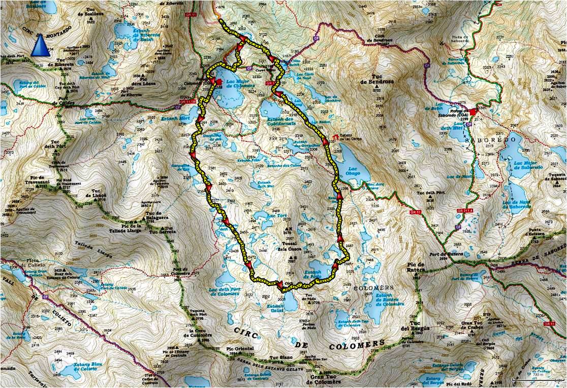 Anem perden alçada, sempre per sender evident i marcat amb la marca de color vermell. Arribem al Lac Obago, un del més característics i grans del circ, concorregut… de bestiar. Anem fent via fins travessar el Lac Redon i Llong, sempre amb gent remullant-s’hi a aquesta època de l’any. En aquest punt decidim baixar al peu de Colomers per un sender alternatiu, molt poc concorregut que parteix del desaigua del llac del Clòto de Baish, que en altres ocasions havíem passat per escurçar, tot i que és una mica més dret, és fàcil i evident de recórrer i que ens deixa pràcticament a final de trajecte. Decidim baixar en taxi, ja que no volem afegir els 3 ó 4 km. de sender paral·lel a la pista d’Aiguamog que ja hem fet en nombroses ocasions, i que és molt bonic per conèixer la vall, especialment la zona de les seves cristal·lines aiguestortes.