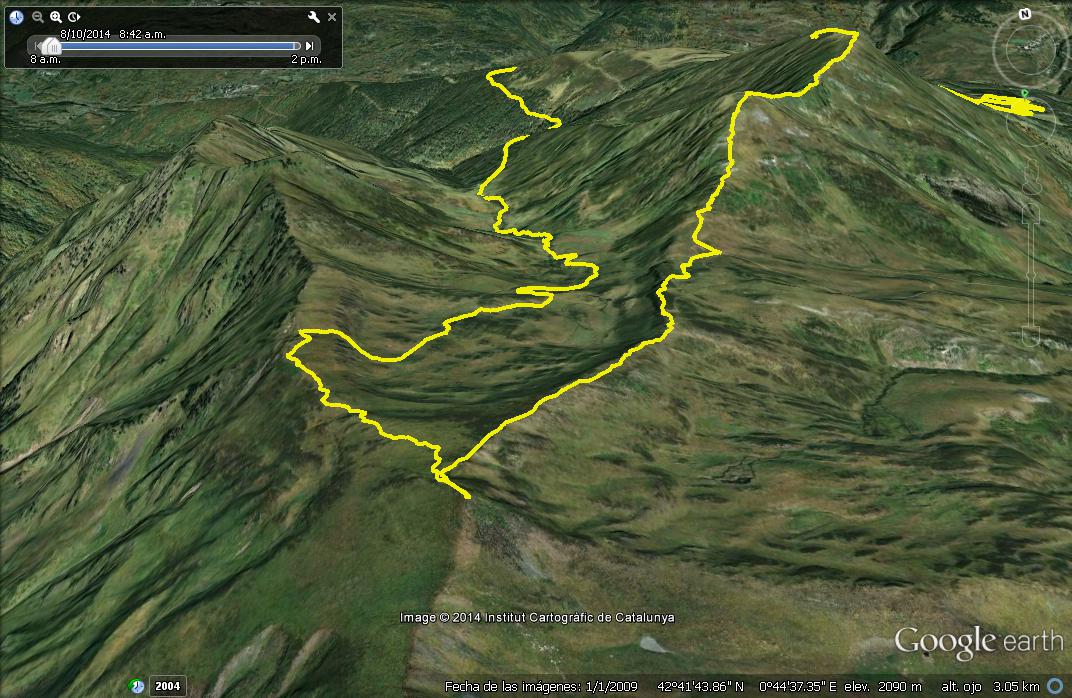 Des d’aquest punt i seguint el curs de les aigües que baixen de les Honts de Gèles pel marcat barranc, estones per banda esquerra i estones per banda dreta creuant el barranc, ens plantem, ja aixecat el dia i amb bon sol, sota el coll d’Eth Santet, que uneix la carena del Letasi amb el Montpius i que dona pas a la banda de Cassau.
