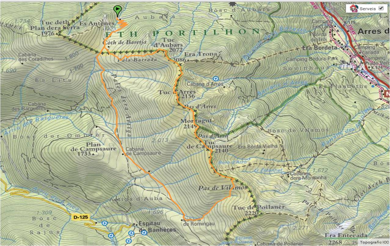 Resseguim i avancem en direcció Sud-Est i Sud després per la carena i assolint els diferents cims arrenglerats. El Tuc d’Arres (2.161m.) ens permet també una magnifica vista cap a la Val d’Aran divisant Es Bordes arran de riu i els pobles d’Arres de Sus i Arres de Jos a l’altra banda de Vall al peu de la Muntanha Ushera.