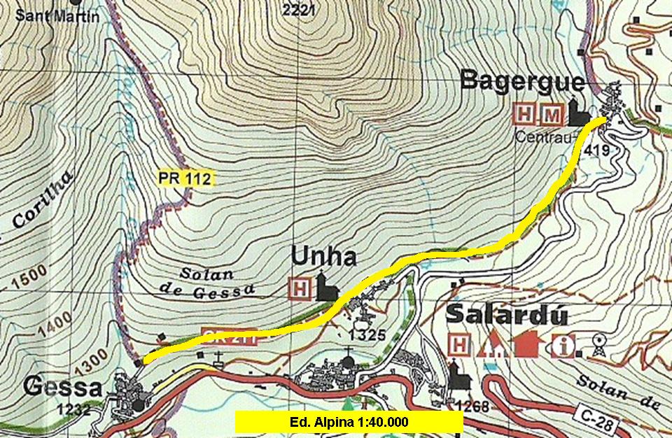 Situats davant l’Església de Gessa que honora a Sant Pere agafarem el Carrer Major com si anéssim cap a Salardu, però just sortir anirem a buscar el GR-211 agafant una pujada que deixa l’escola del poble a la dreta. Una vegada estem en el GR-211 ja no el deixarem fins a Bagergue. El camí marxa planer gran part del mateix i les vistes a través del seu recorregut són molt boniques ja que ens donen unes perpectives dels poblets que són de postal.