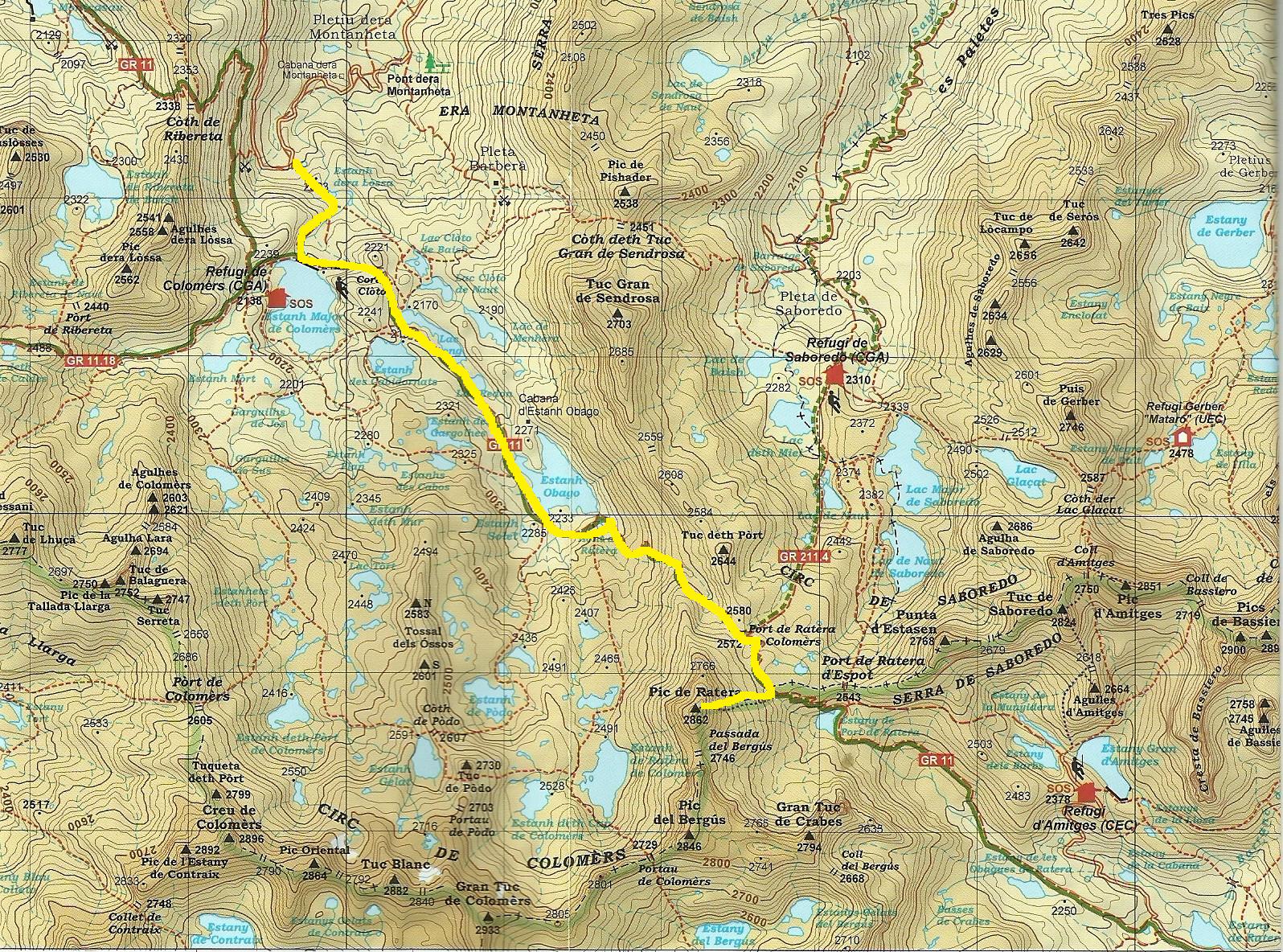 Sense cap dificultat i després de deixar el taxi ens plantem amb mitja horeta a la presa del Lac Major de Colomers. Ens dirigim pel GR11 en direcció Est a l’esquerra del llac fins assolir el Coret de Clòto. Ja no deixem el GR11, ben senyalitzat durant tot el camí, fins el peu del pic.