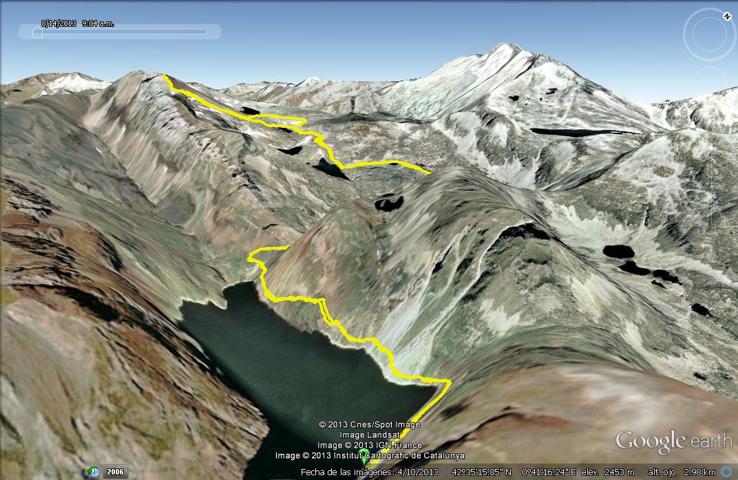 Ataquem la pala final que és d’una terra de color rogenc clar, força esllavissada però fàcil de trenar ziga-zagues que et van pujant per sobre dels tres mil. La pendent final és ja un pel pronunciada, però l’emoció ja no et deixa parar. Les vistes sobre el conjunt del massís de la Maladeta i l’Aneto és impressionant. És la cara contraria que estem avesats a veure des de la Val d’Aran.