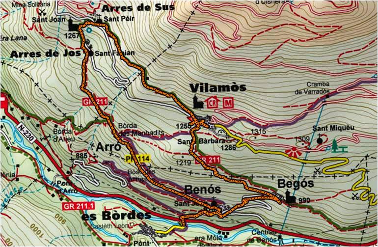 Decidim ara continuar el nostre camí de nou pel GR de baixada cap a Begós i com que es fa tard per dinar, fem un breu recorregut pels seus carrers per seguir per un tram de carretera i llavors per sender fins a Benós i de nou a Es Bordes on decidim dinar-hi.