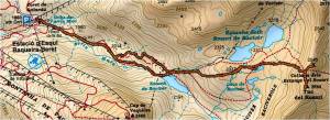Arribem als estanys del Rosari (2.337 m). Admirem el paisatge sense acostar-nos-hi massa per poder enfocar el sender cap al nostre objectiu. Reposem forces i enfilem ara el pas de la Collada dels Estanhs del Rosari, que s’assoleix pujant per un sender rampant en direcció SE entre els dos llacs grans del Rosari. El pas és marcat, bastant més ara que la primera vegada que hi vam pujar fa uns 3 anys.