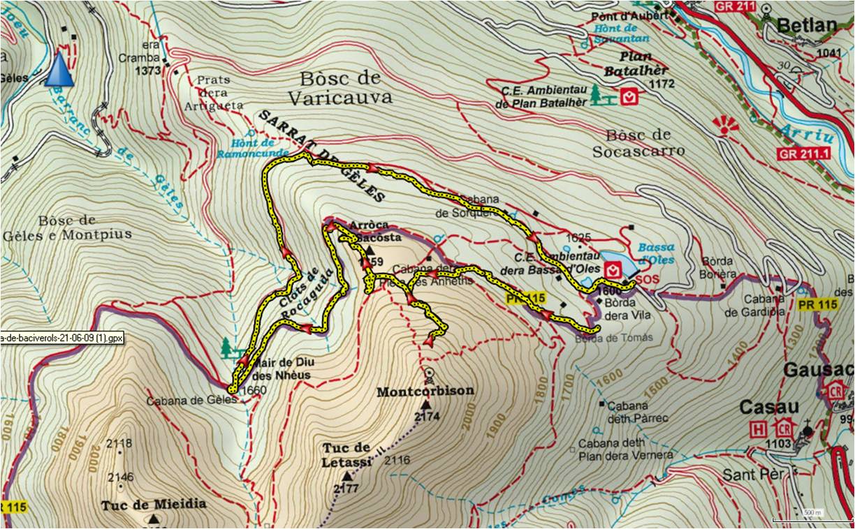 Una mica per sobre de la cota 2.000 m. decidim que no pugem i cerquem una alternativa per passar el matí. Ens entornem i anem a buscar el PR per anar cap el paratge de la Mair de Diu des Nheus passant pel mirador de Rocaguda on el Tuc d’Entecada sembla a tocar. Des d’aquest punt baixem una mica en direcció NO i trobem en un no res el PR que seguim fàcilment fins arribar a la Mair de Diu des Nheus. Des d’aquí agafem ara la pista que sense pèrdua ens porta de nou a la Bassa d’Oles, ara sí amb una munió de gent que ens recorda la nostra Mola un diumenge el matí.